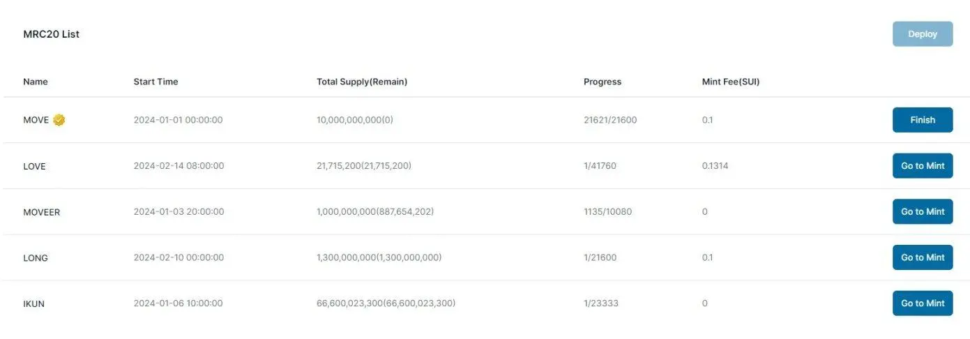 MOVE 是 Sui 链的铭文项目,总发行量为 100 亿代币,完成铸造需要经过 21, 600 个 epoch。即每个 epoch 大约产出 46 万个 MOVE 代币,所有参与的铸造地址平均分配这些代币。