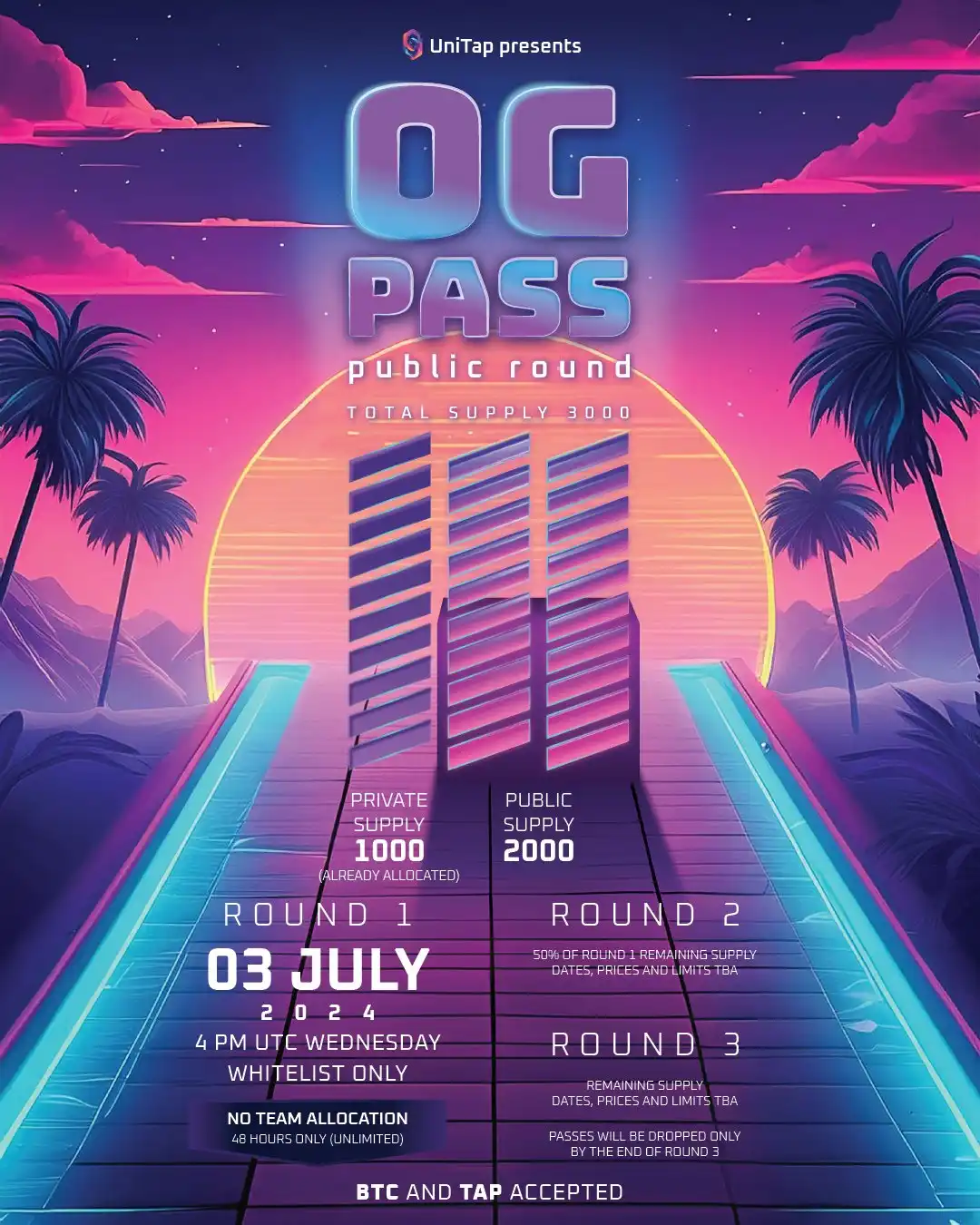 他们将在 7 月 3 日发行一个总量为 3000 的 OG Pass,售价为 0.0049 比特币。持有者在未来将获得 592 枚官方 Token 空投(296 枚 Tap Protocol 上的和 296 枚 Runes 上的)以及免平台手续费。