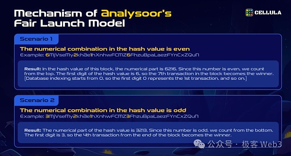 比如在Analysoor的设计中,当前BNB Chain的区块哈希为6mjv…的一长串字符串,里面包含4个数字:6、2、1、6。按照这几个数字在字符串中的排序,第一个数字是6,最后一个数字是6,为偶数,将从前往后计数。提取出来的数字是从0开始计数的,于是数字6对应的交易排序是7,就从当前区块里把第7个充电玩家视为中奖者。当然具体的设计可以更灵活,这里只是举个例子。上述随机性的抽奖算法可以有效激励玩家多充电,调动游戏内生态的活跃度。