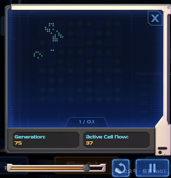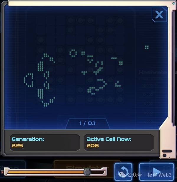 在理解了游戏的核心机制后,我们再来看其他细节:其实BitLife中的活细胞可以溢出到初始的9*9格子外,存活的细胞数可以远大于9*9个,没有边界限制。如图所示,如果某个BitLife包含的活跃细胞数不断增多,其分配到的挖矿算力也会越来越高,而如果BitLife的初始模式选择不当,活细胞数越来越少,算力也会越来越低。