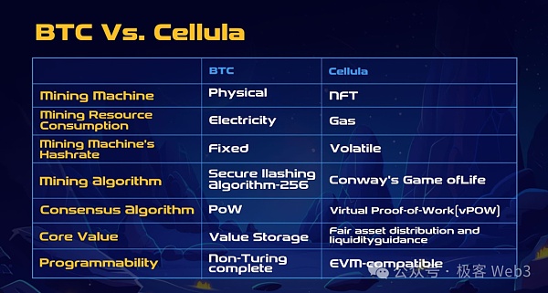 简而言之,**Cellula把传统POW的哈希计算,换成了另一种结果不可预测/难预测的计算方式,替换了“Proof of Work”中的“Work”形式。**在Cellula的思路下,关键在于如何获得存活细胞数更多的培养皿(BitLife),而推演BitLife的状态变化需要耗费计算资源,本质是把BTC挖矿执行的哈希算法变为推演康威生命游戏的特定算法,这被称为vPOW(Virtual POW)。