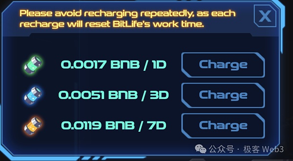 在Cellula中,玩家合成BitLife的过程,就是一个“制造”新矿机的过程。我们前面曾提到,BitLife的实体是一个NFT,**BitLife在链上被mint出来后,要进行“充电”操作才能启动挖矿,**单次充电有效期为1天、3天和7天,需要支付一笔小额手续费,且到期后需要继续充电。