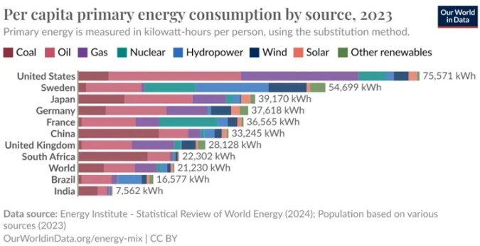 算力的背后是能源,发达国家与高能耗之间存在密切关联,如果我们以人均发电量(千瓦时,kWh)进行图表对比可见。换言之,获取能源过剩是文明进步显现的必要条件。毕竟,在基本生存层面如农业之上叠加了制造业、交通运输、公共服务、城市化和计算等新层次,这些都需要能源的支持。