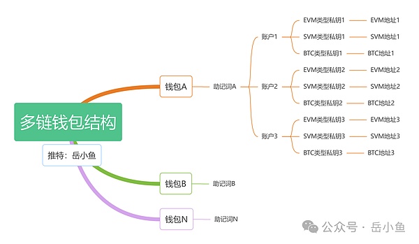 钱包可以生成或导入多套助记词,一套助记词可以生成一个主私钥,主私钥在不同链上可以派生多个子私钥,每个子私钥生成一个固定地址。