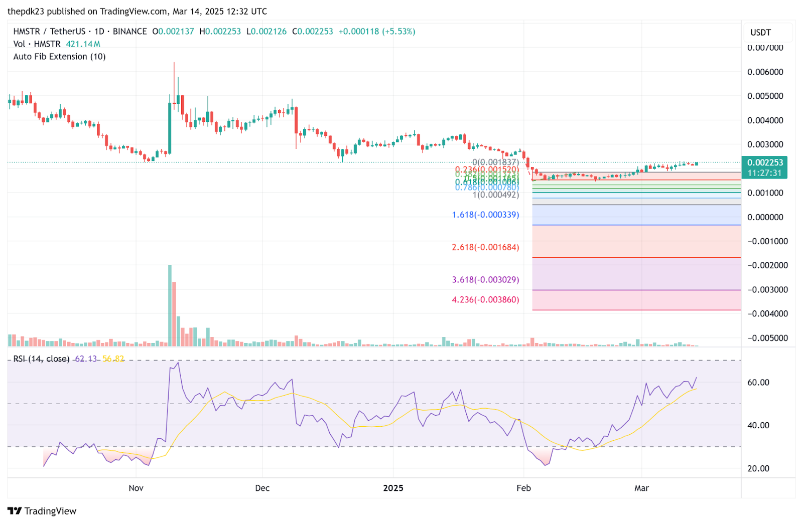 此外,下面的日线图显示,相对强弱指数(RSI)读数为62.13,表明HMSTR正在接近超买区域。